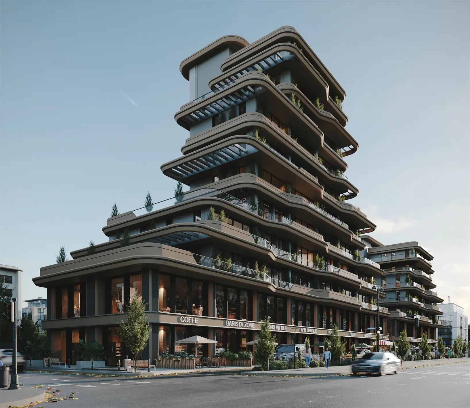 Çevredeki yapılar genellikle dikdörtgen prizmalardan oluşmaktadır . Ancak yapılara özgün bir nitelik sağlayacak güçlü prizmatik etkiler verilememiştir. Sanat Merkezi yapısının hacim büyüklüğü ile değil, plastik etkisiyle öne çıkması amaçlanmıştır. İşlevlerin niteliği ve mevcut otoparkın kolon sistemi ızgara bir plana zorlamaktadır. Plan tasarımında bu düzen korunmuş ancak üçüncü boyut özgünlüğü eğimli bir kabukla sağlanmaya çalışılmıştır.